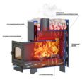 Дровяная печь для бани Везувий Русичъ предназначена для отопления парильного помещения бани или сауны, получения пара и нагрева воды. Максимальная объем отапливаемого помещения 14 м3. Изготовлена из особо прочной котловой стали марки 09Г2С 6-8мм. Печь топится сухими дровами. Дверца изготовлена из чугуна со вставкой из стекла. Топочное пространство отделено от дымохода чугунным зубом отбойником. Отбойник помогает перекрыть прямой ход пламени из топки в трубу, тем самым позволяя дровам полностью сгореть. Эта важная деталь задерживает тепло внутри конструкции. Открытая каменка вмещает до 40 кг камней, позволяя равномерно распределить температуру в парной. К печи необходимо подключить дымоход диаметром 115 мм.